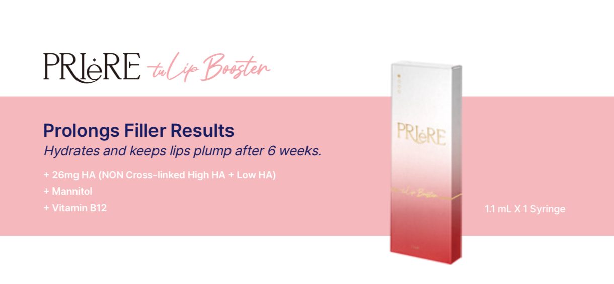 Priere Tulip Booster is a None-Cross linked Hyaluronic Acid tint for lips, it came with Vitamin B12for natural red color (The same vitamin redness from The Red lipolysis). It hydrates lips while providing a redness tone for lips, patient no longer need to wear lip stick while having Priere Tulip booster. If you are looking for the filler, please check out Priere Tulip Filler instead. This tulip booster is not a filler, it is none cross linked tint instead.